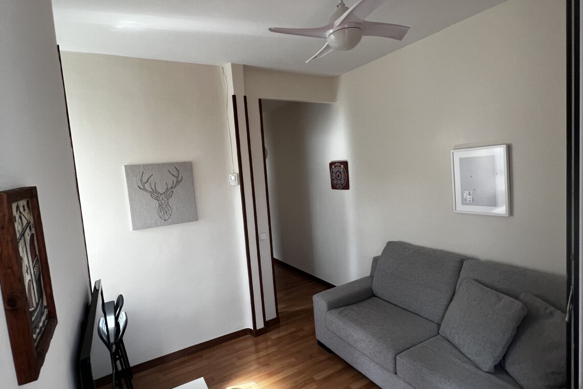 El segundo dormitorio, tiene cama individual, escritorio y área de almacenamiento. El baño es amplio, con almacenamiento y acabados de primera calidad; el salón de acceso a la terraza está amoblado y tiene mesa de comedor y tv.