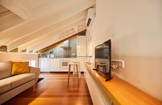 En esencia, el estudio cuenta con un recibidor el cual permite tener acceso al área de la cocina; punto del cual se puede acceder a una zona donde tendremos a nuestra disposición un escritorio con impresora, una cama tipo matrimonio, un sofá considerablemente amplio, TV, una mesa tipo comedor, armarios empotrados y, como no podía ser de otra manera, aire acondicionado y calefacción. Se incluye también el Wifi.